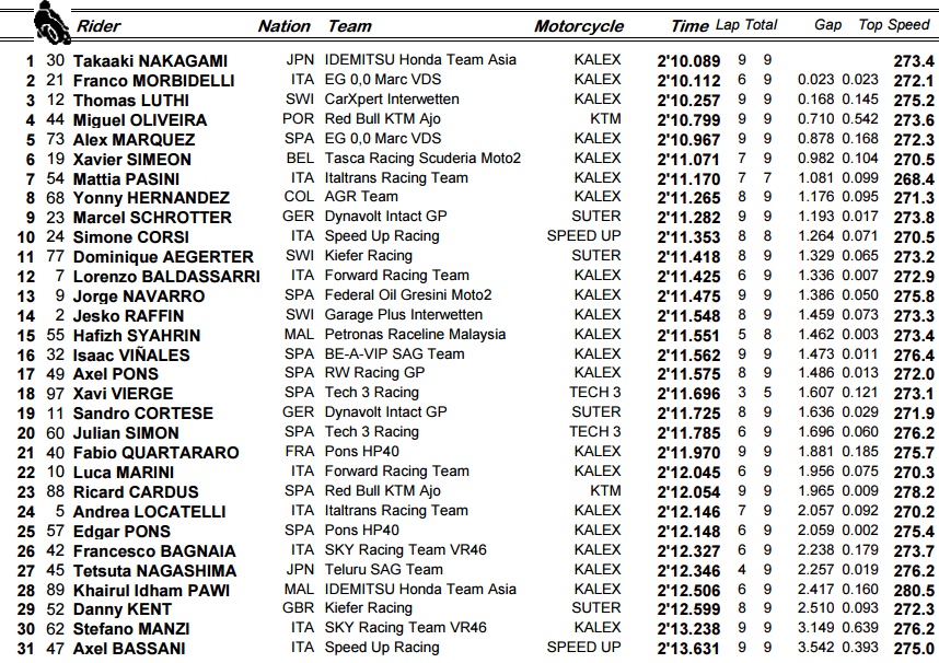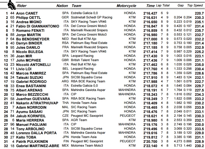 Το 2.16.427 του Ισπανού ήταν αρκετό για να τον διατηρήσει στην κορυφή ως το τέλος, με τον Oettl να μένει 0.204sec μακριά του. Την 3η θέση κατέλαβε ο Andrea Migno, με τους συμπατριώτες του, Fabio Di Giannantonio και Romano Fenati να συμπληρώνουν την πρώτη πεντάδα. Πολύ πίσω έμεινε ο πρωτοπόρος της βαθμολογίας Joan Mir (10ος) αλλά και ο John McPhee (11ος).