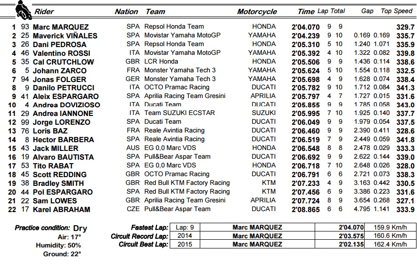 O Maverick Vinales στη συνέχεια κατάφερε να πλησιάσει τον χρόνο του συμπατριώτη του στα 0.034sec, με τον Marquez να βελτιώνει στη συνέχεια και άλλο το χρόνο του κατά 0.135sec. Ο χρόνος του έμεινε στην κορυφή της κατάταξης ως και το τέλος, με τον Vinales να ολοκληρώνει 2ος και τους Pedrosa-Rossi να ακολουθούν με πάνω από 1sec διαφοράς.
