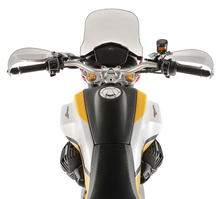 Στοιχεία που η Moto Guzzi μας βεβαιώνει, ότι μεταφέρθηκαν στο παρόν και στην V85. Το ρεζερβουάρ είναι ακόμη ένα στοιχείο που μεταφέρθηκε από τις μοτοσυκλέτες του Dakar, τονίζοντας έτσι περισσότερο το ρετρό στυλ.